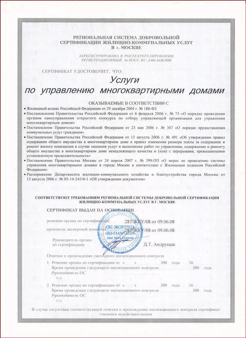 Услуги по управлению многоквартирными домами оказываются в соответствие с имеющимся Сертификатом № 6.У0.85.1.08 от 10 июня 2008г. и предоставляются на основе действующих нормативных документов: